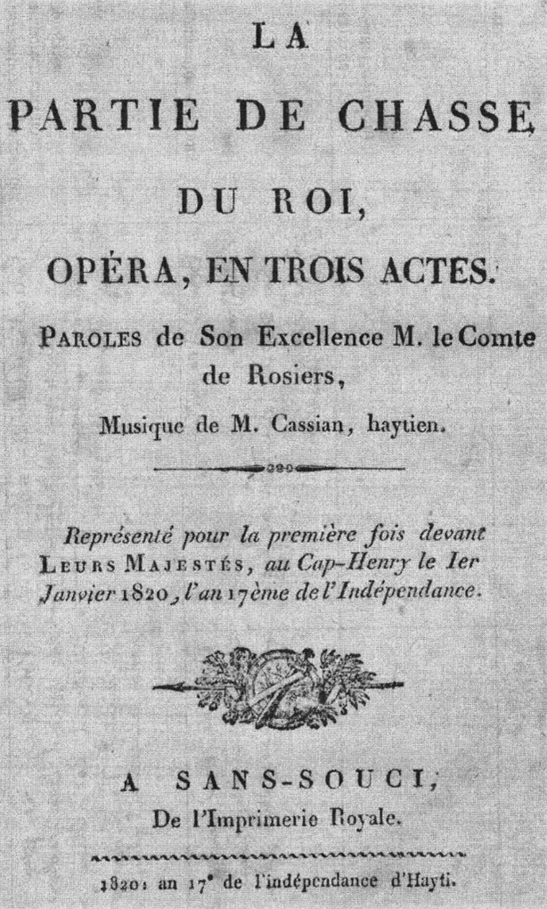 Il importe néanmoins d’observer l’émergence d’un nouveau paradigme au royaume de Christophe en 1820, celui constaté aussi par Bernard Camier, à l’effet que « nous sommes passés d’une chanson coloniale qui représente les Noirs comme Marie-Antoinette se représentait les paysans [français] au Petit Trianon à une affirmation inconnue à l’époque précédente et qui apparaît désormais au grand jour[19] ». Ainsi, la composition d’ariettes originales en lieu et place des timbres français par « Cassian Haytien », signalée en couverture de La Partie de chasse du roi constitue la symbolique la plus forte de la naissance de cette nouvelle ère consacrée à la recherche d’une autonomie culturelle.